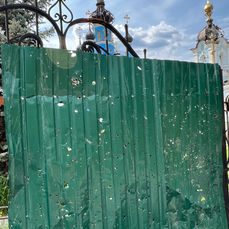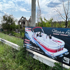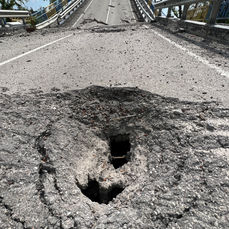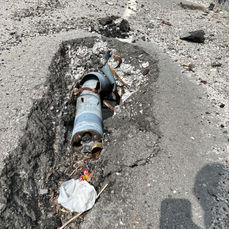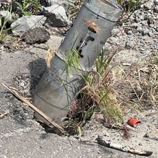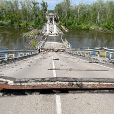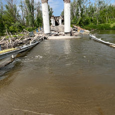 On our way to a drop in Sviatohorsk, we came across the second no-longer-intact bridge of our travels. Google Maps is apparently unaware that it was destroyed by the Russians last fall. When we stopped to look at the bridge, we heard an ominous sound overhead. Looking up, there was a drone immediately above us, definitely NOT what one wants to see in Ukraine! It was likely a Ukrainian drone, but the odd thing is, there wasn't a living soul in site. When we looked around us at the town of Bohorodychne, virtually every single building was destroyed. It was one of the most completely devastated areas we've seen in all our travels, I can just imagine the ferocity of the fighting that went on here. About 1.5 hours later, as we were getting ready to leave the town after walking around to photograph the destruction, there was a loud BOOM on the other side of the valley - a Russian missile hitting. We could see the smoke trail where the missile landed (photo of it below). As with many of their strikes, there was nothing of value in the area, and we're not even sure if struck anything other than the ground. Still, it was a reminder that we weren't all that far from the front.